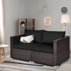 Tangkula 4PCS Rattan Corner Sofa Set Patio Outdoor Furniture Set W/ Black Cushions