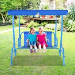 Tangkula Kids Patio Double Chaise Lounge Outdoor Wooden Recliner W/Canopy & Cup Holder