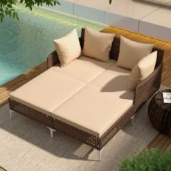 Tangkula Outdoor Rattan Double Daybed Wicker Chaise Lounge For 2 W/ Seat & Back Cushions