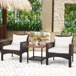 Tangkula 3PCS Patio Rattan Bistro Set Acacia Wood Frame Cushioned Sofa And Side Table