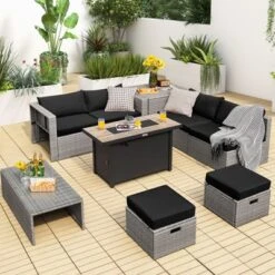 Tangkula 9 PCS Rattan Dinning Set Wicker Sofa W/Propane Gas Fire Pit 60,000 Btu Heater