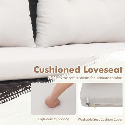 - Package Includes: 1 x Loveseat, 1 x Coffee Table, 2 x Back Cushions, 2 x Seat Cushions