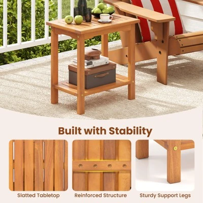 Enhance your outdoor or indoor living space with the timeless elegance of the Tangkula 2-tier side table. Expertly crafted from premium acacia wood, this end table blends natural rustic charm with modern functionality. Whether you are relaxing on the patio or looking for a stylish accent piece for your living room, this durable table offers the perfect surface for your coffee, books, and decor.