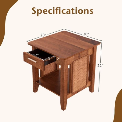 Our boho nightstand will elevate your home decoration. Featuring timeless rattan and walnut grain, this nightstand adds a touch of elegance to any room. This nightstand offers extra storage space. The spacious top, pull-out drawer and open shelf will provide space for your coffee mug, table lamp, book and magazine. Reliable rubberwood legs ensure solid construction, and the smooth tabletop is easy to clean. Without a doubt, this versatile side table is a beautiful and long-lasting addition to your home.