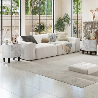 Elegantly designed, this multifunctional end table combines style and functionality seamlessly. Featuring a spacious tabletop and 2 drawers, it provides convenient storage for every need. Sturdy legs with a 2.4″ diameter ensure stability and a high load capacity. The faux marble surface adds a touch of sophistication while being easy to maintain. With gold pulling knobs and metal drawer slides, this nightstand offers seamless drawer operation. Its versatile design allows for use in various rooms as a side table or bedside table, adapting effortlessly to different settings. Additionally, a 6.5″ bottom clearance offers convenience for sweeping.