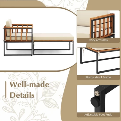 Indulge in unparalleled comfort and exceptional durability with our acacia wood chaise lounge chair!Vary from others, our pool lounge chair includes an armchair and an ottoman, which allows you to tailor the arrangement to your specific needs. Both armchair and ottoman are designed with soft and thick cushions, providing you with a comfy sitting or lying experience. Moreover, the solid acacia wood and heavy-duty metal frame endow this patio furniture set with strong stability for robust support.
