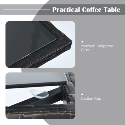 - Materials: Powder-Coated Steel, PE Rattan, High-Density Sponge, Tempered Glass, Polyester Fabric
