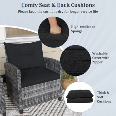 - [Requires Little Maintenance]: Our outdoor wicker chair set requires less care. Just clean the surface occasionally with a damp cloth to keep its original state. The smooth glass tabletop allows you to wipe stains off effortlessly. What’s more, the zippered cushion cover is detachable and washable, which facilitates your daily maintenance.