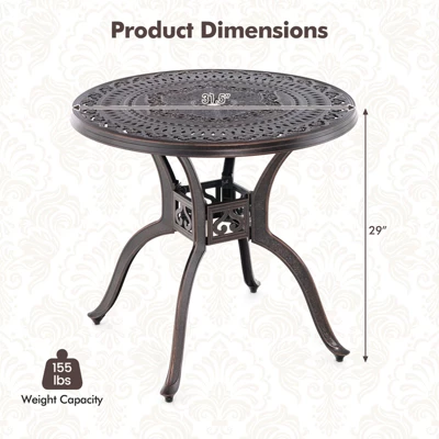 Experience outdoor sophistication with this sturdy cast aluminum patio table. Crafted from cast aluminum, this table is exceptionally long-lasting and designed to withstand outdoor elements. The table features a 2″ umbrella hole, perfect for providing shade on sunny days. Stability is ensured with reinforced construction, gracefully curved legs, and adjustable footpads. The intricate patterns on the tabletop add a touch of elegance, making it a versatile addition to any outdoor space. This table combines strength with class, making it the perfect addition to your outdoor leisure area.