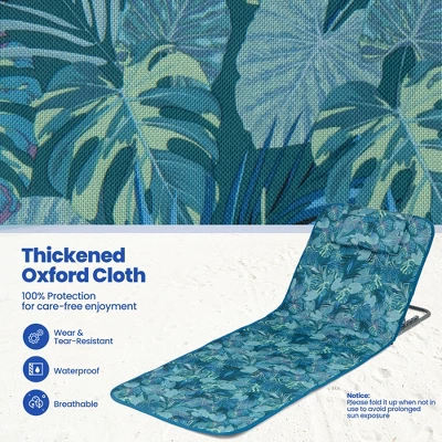 Create a Comfortable & Breathable Zone on Your Beach Travel or Camping! Our 3-piece folding mat set can be used for the beach to enjoy sunbathing & tanning, camping for resting, and backyard for lounging & reading books on the grass. The beach mat is made of breathable and weatherproof oxford fabric, providing a comfortable and cozy lying experience. In addition, the beach chair is supported by a strong aluminum frame that is rust-resistant and durable. And thanks to the 5-position adjustable locking system, you can adjust the chair easily for optimal reclining comfort. More importantly, the reclining chairs and table both can be folded in seconds for easy transportation, and it is easy to store which would not take up too much space.