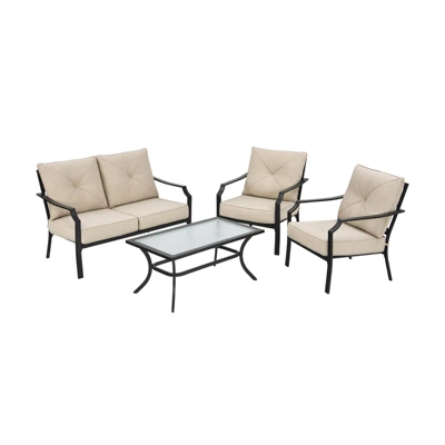 - Package Includes: 1 Loveseat, 2 Chairs, 1 Coffee Table, 8 Cushions, and Assembly Instructions