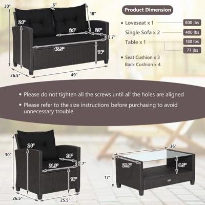 Elevate your outdoor living experience with the Tangkula 4-Piece Rattan Patio Furniture Set. Designed for durability and style, this premium collection brings together sophisticated aesthetics and rugged performance, perfect for hosting guests or relaxing in your garden, poolside, or balcony.