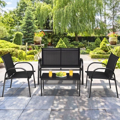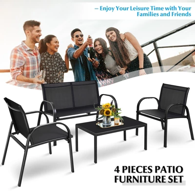 This is our brand new 4 PCS furniture, including 1 loveseat ,2 single armchair and 1 tea table. It is sturdy and durable since it’s made of steel frame. Also the modern structure and classic black color look very stylish. The table with a piece of glass is useful for putting your cups, fruit and any other things. It’s easy to clean the table. Don’t be hesitant,Buy it today!