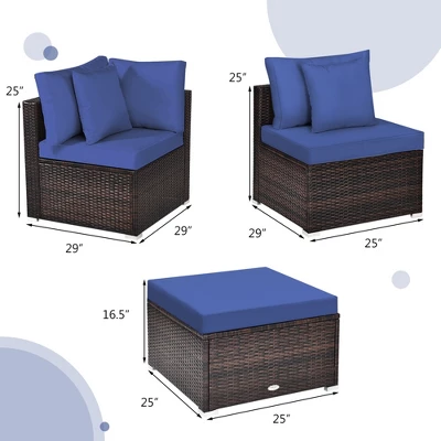 - Dimensions of Patio Sofa Set: Size of each corner sofa: 29″ X 29″ X 25″ (W x D x H); Armless sofa size: 29″ X 25″ X 25″ (W x D x H); Ottoman size: 25″ X 25″ X 12.5″ (W x D x H); Thickness of cushion: 4″; Weight capacity of each sofa: 360 lbs.