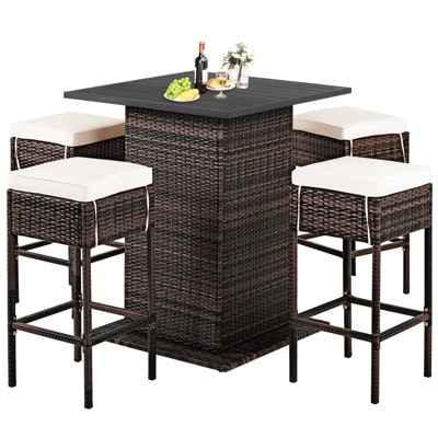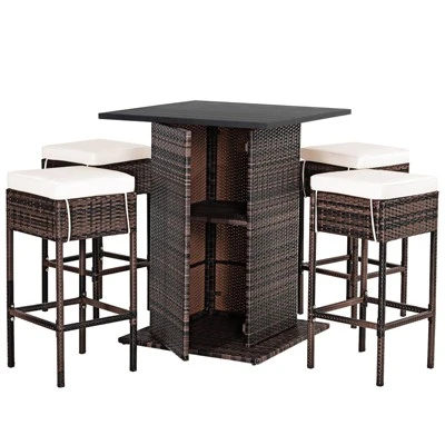 Enjoy your leisure time with this 5pcs outdoor furniture set! Made of all-weather PE rattan wicker and anti-rust steel frame, our outdoor furniture set is long-lasting and solid. In addition, the thick and soft cushions allow you to comfortably sit, releasing your fatigue. Besides, the practical bar table with long-lasting PS slat tabletop is easy for you to put in different belongings. Storage shelf under tabletop guarantee ample storage place. Moreover, placed in the garden, patio, poolside, etc, this 5-piece rattan set is an ideal place for entertainment and gathering.
