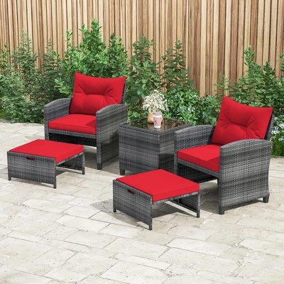- 【Elevate Your Outdoor Space】Transform your balcony, poolside, or garden with this elegant 5-piece patio conversation set. Featuring 2 cozy wicker chairs, 2 ottomans, and a chic tempered glass top coffee table, it creates a perfect blend of casual luxury for both indoor and outdoor use.