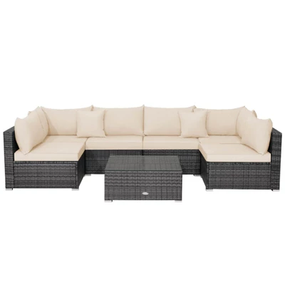 Transform your backyard into a luxury retreat with the Tangkula 7-piece patio furniture set. Designed for those who value both style and relaxation, this modular sectional allows you to create the perfect seating arrangement for hosting garden parties or enjoying quiet afternoons. Featuring premium mix-grey rattan and plush beige cushions, this set brings sophisticated comfort to any patio, poolside, or deck.