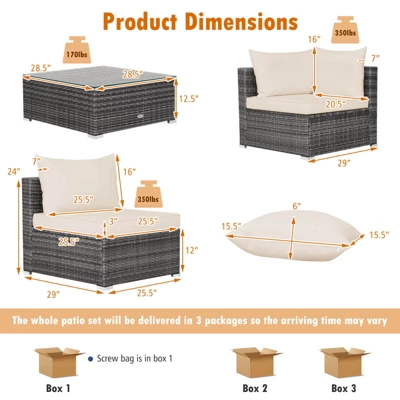 - Package Includes: 1 Table, 2 Corner Sofas, 4 Armless Sofas, 2 Throw Pillows, 14 Cushions