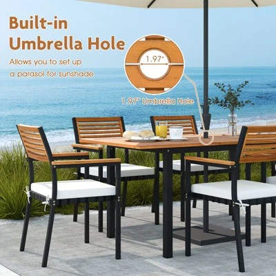 Are you looking for a versatile patio dining set that enhances your outdoor space? This premium 7-piece set includes a rectangular table and 6 armchairs, made from natural acacia wood that’s easy to maintain. The expandable tabletop (51″-64″) is easy to control, pull away the table panels towards the side, place extension board and push inward to merge. The table also comes with a built-in umbrella hole (1.97″) for sun protection. Besides, the chairs can be stored under the table or stacked, saving space when not in use, and the high-density sponge cushions with a tilt slat backrest provide comfort and a cooling experience.