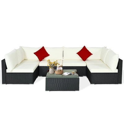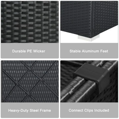 Our outdoor patio sofa is crafted with exquisite wicker and powder coated steel, which is sturdy enough to support more people to have a rest or sit. The rattan surface has sun protection and is waterproof. You will not worry the durability even it is exposed under the bad weather. The whole package includes 4 armless sofas, 2 corner sofas and 1 table. It means it can not only be placed in one way but also can be rearranged in various ways to meet your different needs. Built by high quality craftsmanship, this patio furniture set features black PE rattan fit your home decoration well, which is perfect addition to patio, garden, backyard, pool and other space.