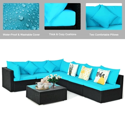 - Super Comfortable Sofa Set: In order to provide you the cozy experience, this patio conversation set have not only spacious seats but also thick seat cushions, backrest cushions and two pillows. Besides, the seat cushions have water-proof and washable cover which has built-in smooth zipper for easy cleaning.