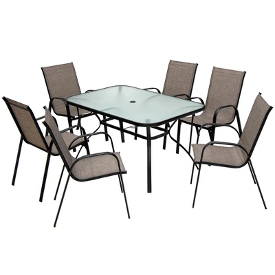 This 7-piece patio dining set provides a perfect dining environment for you and your family. You can sit outside with an umbrella to have a meal or conversation with friends. It will also be a great decoration for your indoor places with stylish appearance. These chairs are stackable for space-saving. Plus, the ergonomic backrest and armrests ensure a cozy sitting experience, and you will not feel uncomfortable after sitting for a while. With rustproof steel frame and wear-resistant fabric, this patio dining furniture set can be used for many years.