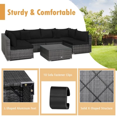 - Long-Lasting Outdoor Use: All the 7 pieces are supported by heavy-duty and rustproof steel frame, and thus can load heavy weight. The L-shaped aluminum feet also highly improve the overall stability. Each sofa can load 350 lbs and the table can load 170 lbs. Apart from that, the rattan surface is elegant and fade resistant, which can withstand long-time outdoor use.