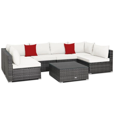 With this 7-piece patio rattan sofa set, you will spend a soothing leisure time with your friends or family. Constructed of stable steel frame and well-woven rattan, both the table and sofas are of high stability and suitable for long-time outdoor use. Each piece is designed with L-shaped aluminum feet on the bottom to avoid wobbling. And 10 fastener clips are provided to connect the sofas firmly. In addition, the sofa set will bring you comfortable sitting experience with seat cushions, back cushions and throw pillows. The zipper design makes the cover of cushions and pillows easy to remove and clean. What’s more, the coffee table is practical and allows you to easily fetch the items you want. The tempered glass table fixed by 4 suction cups is super sturdy and resists to scratches well.