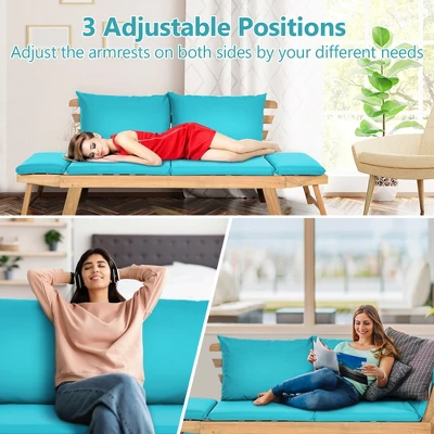 - 3 Adjustable Positions: This daybed features different positions to act as 3 furniture pieces in 1. Armrests at both sides can be independently adjusted up or down to transform the furniture to a loveseat, a bed or even a chaise lounge, which can adequately meet your seating, lounge or sleeping needs. When you adjust down the armrests on two sides, please expand the leg under the armrest.
