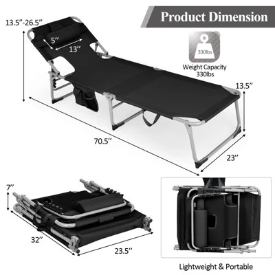 - 【Removable Pillow with Hole for Face】The extra pillow and soft cushion of this recliner can make you sleep comfortably in the outdoor breeze for a while in the afternoon. And you can remove it to get your back tanned when sunbathe face down and read a book. Also, you can use the side storage pocket to keep items on hand.