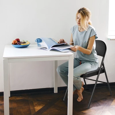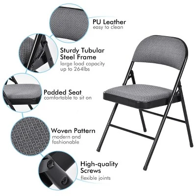 Topbuy Fabric Padded Folding Chair is one of the best complements to your living surroundings. Compact size and portable folding design make it an ideal addition to small apartments, condos or dorm rooms. Offered as a set of 4, chairs can be stacked on top of one another without shifting. Features a padded, contoured fabric seat and back, these steel chairs provide more comfort and can last for long time. Perfect for both indoor and outdoor use.