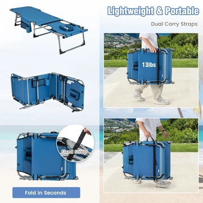 Our beach chaise lounge chair is really a a complete lounger with a soft cushioned pillow and a face hole who are tanning lovers! Made of high-quality oxford fabric, this sunbathing recliner is sturdy enough to stand the test of time. The premium metal frame is long-lasting and heavy duty for both indoors and outdoors with a load-bearing capacity of up to 400 lbs. Featuring 5 different backrest positions and 2 adjustable leg positions, the patio lounge chair provides extraordinary comfort and relaxation for you. When not in use, the chaise lounge chair can be folded into a compact size in seconds. Can be used both indoors and outdoors, such as beach, office, yard, lawn, etc.