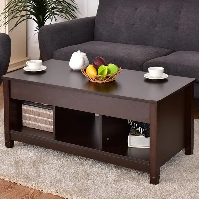 Topbuy Products presents this lift top coffee table. Add a multi-functional piece to your home decoration. This modern center piece is crafted of a solid wood construction and metal hardware. It is designed with a smooth finish and a contemporary shape to match any home . Versatile and non-traditional, this coffee table has a lift top mechanism, ideal for laptops and extra storage. Store books, magazines, blankets, and remotes in the hidden compartment and 3 lower shelf. Update your living area today with the Topbuy Products Lift Top Coffee Table.
