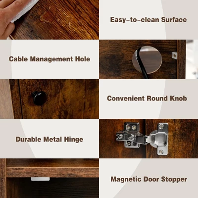 This brand-new nightstand comes with 2 AC outlets and 2 USB ports to charge your phone,tablet,laptop,lamp,etc. The 6.5-foot power cord allows you to move this beside table freely. A cable management hole helps to keep the tabletop clean and organized. What’s more,our nightstand with charging station offers sufficient storage options,including a wide top,an enclosed cabinet and 3-tier open shelf. Even better,the 6-level adjustable shelf is also removable for storing larger items. Its vintage/modern look definitely adds a touch of glamour to your bedroom!