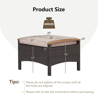 - Product Information: Coming with a detailed and clear instruction, the patio rattan ottoman set is not so hard to install. Please do not tighten all the screws until all the holes are aligned. Dimension of each ottoman: 25” x 20” x 16” (L x W x H)/63 x 51 x 41 cm (L x W x H). Please refer to the size instructions before purchasing.