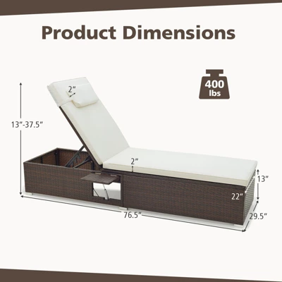 Indulge in ultimate relaxation with this patio chaise lounge. Featuring 6 adjustable backrest positions, you can easily find the perfect angle for various outdoor activities. The anti-fading and long-lasting PE rattan adds a touch of elegance while ensuring a long service life. The long and soft cushion provides enhanced comfort for both the seat and back, and the detachable headrest adds an extra level of coziness. The sturdy metal frame allows the patio recliner to support up to 400 lbs with stability. Whether placed in the backyard or by the poolside, this versatile chaise lounge is ideal for any outdoor occasion.