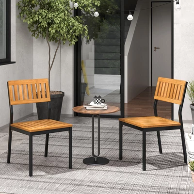 Elevate Your Dining Experience!Our patio dining chair set includes 4 chairs, each chair measures 18” x 23” x 34” (L x W x H), and the seat height is 17.5”. Constructed of reliable acacia wood and treated with oil finished treatment, the wooden seats and backs of these chairs ensure longevity and resistance to daily wear. Besides, equipped with heavy-duty powder-coated metal frames and adjustable footpads, each chair is designed to offer maximum stability and support, ensuring 400 lbs strong loading capacity. Other than that, these outdoor armless dining chairs boast curved backrests and breathable wood slats, enhancing your sitting experience during meals or gatherings. With a seamless blend of warm acacia wood and sleek metal, this set embodies a versatile style that effortlessly complements any indoor or outdoor setting.