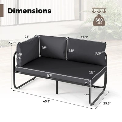 Enjoy outdoor leisure time with our patio loveseat!Constructed with a heavy-duty metal frame, the outdoor bench is sturdy and built-to-last. The breathable, wear-resistant, and fade-resistant fabric brings you cool sitting feelings and ensures long-term use. The soft cotton padded seat cushion and pillows ensure optimal comfort. The side armrests ensure more comfort. Featuring a spacious seating area, you can sit with your friends in the yard, garden, porch, poolside, and more. To prolong the lifespan, please avoid leaving the loveseat outdoors during rainy days.