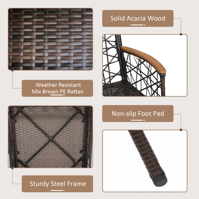 - 【Ergonomically Built】 This PE wicker chair set has a generous seat surface and slightly curved backrest that are good for your back and spine when sitting for a long time. Moreover, the ergonomic armrests made of solid acacia wood are cozy enough, allowing you to rest your hands on them and enjoy a relaxing time.