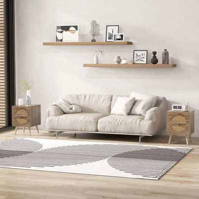 The rattan nightstand set of 2 is a seamless blend of functionality and style that adds a touch of elegance to any room. This duo is more than just furniture; it’s a practical solution to keep your room organized and chic. Each piece features a spacious countertop and smooth-operating drawers, offering ample storage space for your nighttime reads and adding convenience to your daily routine. The charm of the rattan design, combined with sturdy pine wood legs, results in a long-lasting yet appealing look that complements your interior decor. Metal handles add a sophisticated touch, and non-slip foot pads are designed to protect your floors from scratches. A clearance of 17 cm (6.5 inches) under the stand allows for easy cleaning, making maintenance a breeze. They can serve as end tables, coffee tables, or bedside tables, adapting to your needs.
