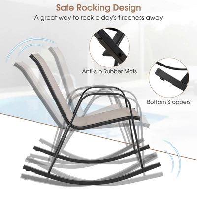 Enjoy the ultimate comfort of gentle breezes with your significant other on our set of two rocking chairs!Each chair is designed with ergonomics in mind, featuring curved armrests and a backrest that will make you feel incredibly comfortable when seated. The sturdy rocking base provides a gentle rocking motion and is equipped with bottom stoppers for added safety. Moreover, these rocking chairs boast exceptional durability, thanks to their super solid metal frame and firm screw connections that enhance overall stability. The seats and backs are made of breathable and quick-drying fabric, ensuring a cool and comfortable sitting experience. Whether you’re seeking snug chairs for outdoor relaxation, these two rocking chairs will be the perfect fit for you.