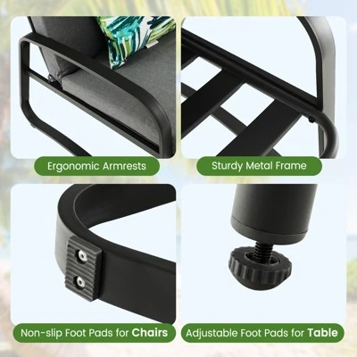 - Enjoy enhanced comfort with the ergonomic armrests. Non-slip foot pads for the chairs, and adjustable foot pads for the table