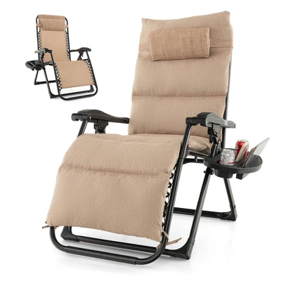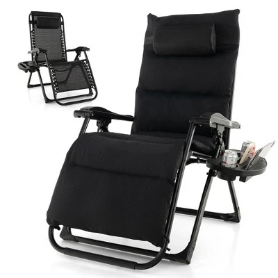 This outdoor recliner is equipped with an adjustable reclining system that allows you to find your perfect position, ranging from 90 to 170 degrees. Additionally, it features a lockable mechanism, ensuring that once you find your desired position, it will remain securely in place. The upgraded comfort and strong bearing capacity of this gravity recliner chair are provided by its soft padded cushion and sturdy metal frame, supporting up to 440 lbs. If you prefer a more breathable experience, simply remove the cushion. This patio recliner also comes with a cup holder tray, allowing you to keep your favorite beverage within arm’s reach as you unwind. Furthermore, the headrest offers additional support for your neck and head.